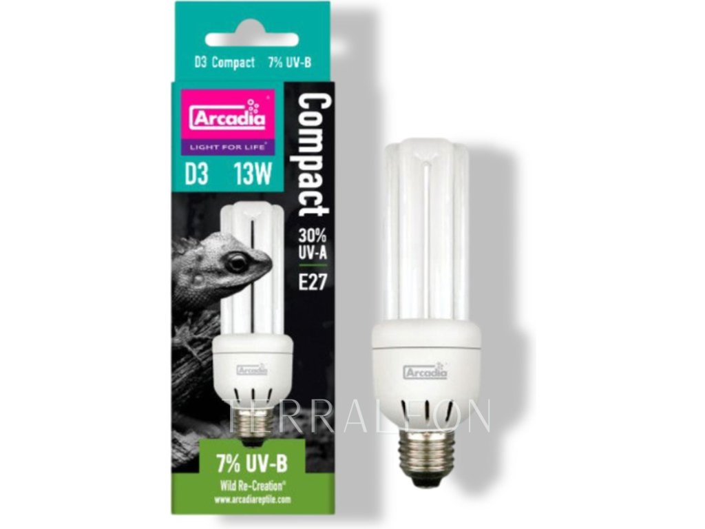 Tato kompaktní zářivka od Arcadia představuje špičku ve své kategorii. Compact Reptile Lamp 23W se 7% UVB a 30% UVA je vhodná pro druhy s nižšími nároky na UVB záření. Tato zářivka vyniká velkým množstvím viditelného světla s plným spektrem (6500 K), dlouhou životností UVB záření, vysokým CRI 90+ a vylepšeným sklem.