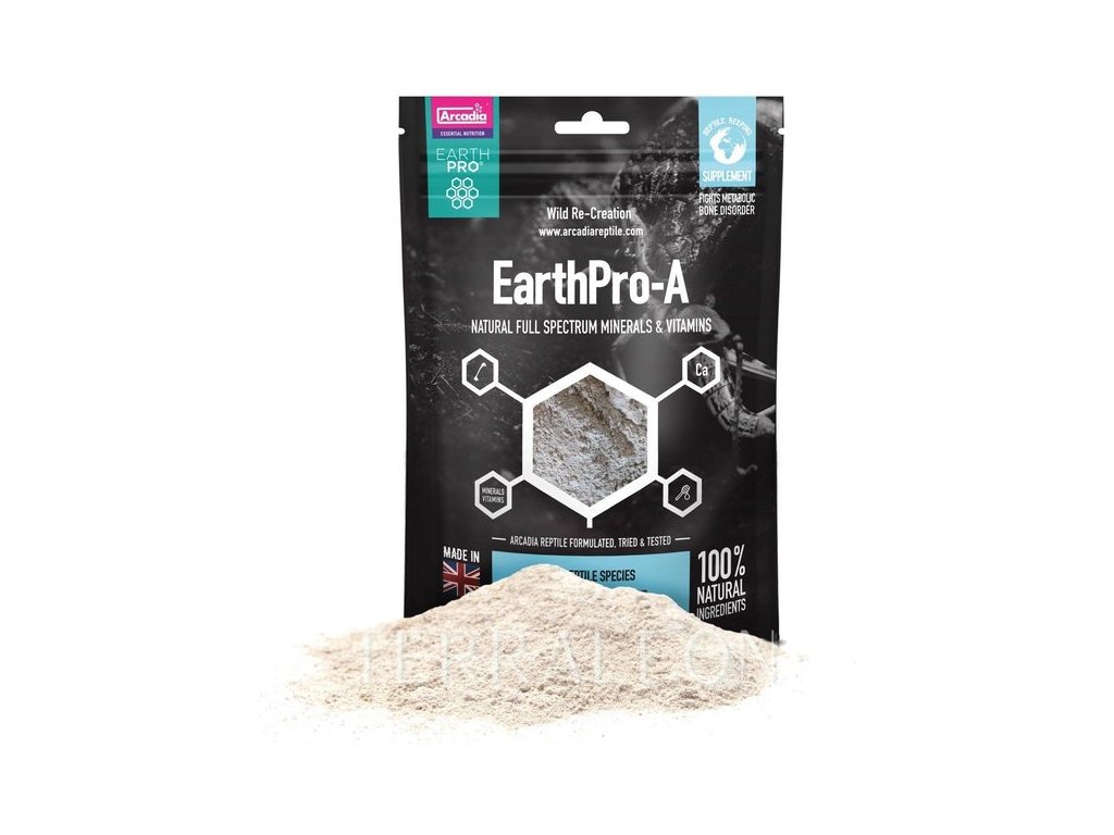 Arcadia EarthPro-A je přírodní vitamino-minerální přípravek v práškové formě vhodný pro všechny druhy býložravých a všežravých plazů, obojživelníky a exotická zvířata. Dodává všechny životně důležité vitamíny a minerály v přírodní formě. Obsahuje vyvážený poměr vitamínů skupiny B, které mají pozitivní vliv na imunitní systém, regeneraci a celkové zdraví plazů.