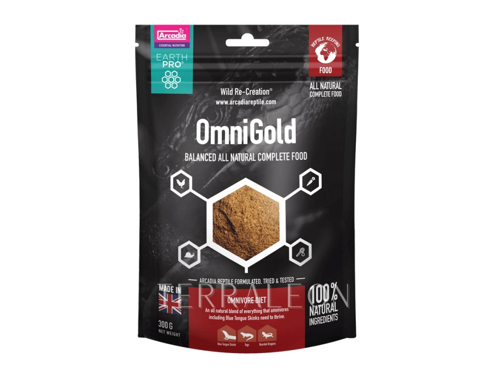 Kompletní instantní gelové krmivo určené pro všežravé druhy plazů (ty, kteří se v přírodě živí zároveň hmyzem a rostlinnou potravou či ovocem). OmniGold představuje perfektní způsob krmení některých druhů gekonů, mnoho druhů scinků, teju,varanů, agamy vousaté a pralesnícj druhů želv. Vzhledem k obsahu proteinů krmivo není vhodné pro čistě suchozemské druhy želv.
