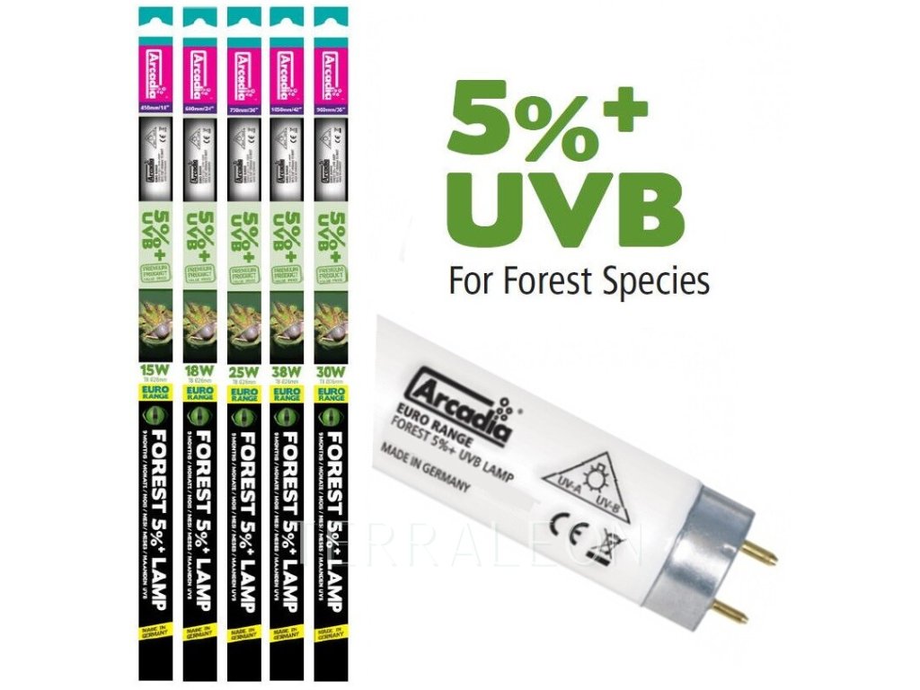 op UVB zářivka ARCADIA Euro Range Forest 5% T8, která vyniká výrazným dosahem UVB záření a jeho dlouhou životností. Navíc mají skvělý poměr UVB:UVI a disponují vysokými hodnotami UVA záření. UVB zářivky ARCADIA jsou vyráběny v Německu.