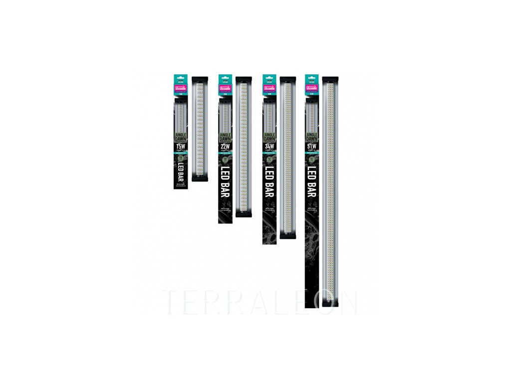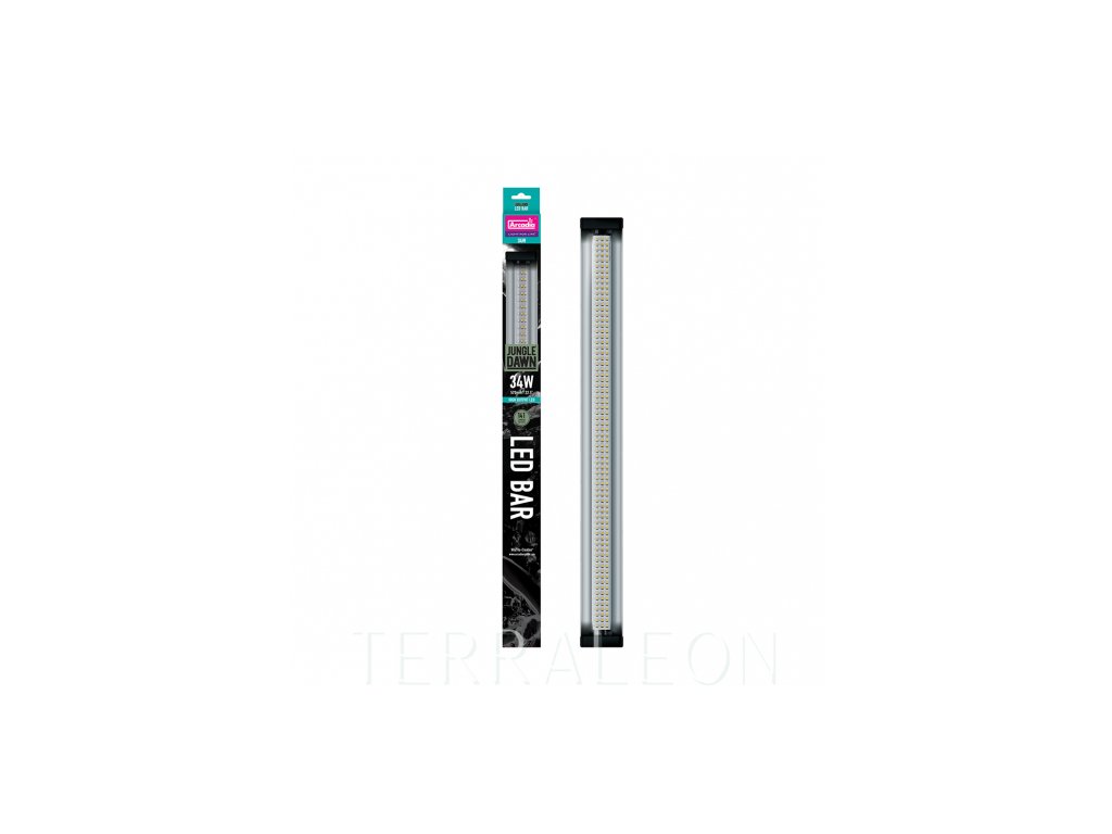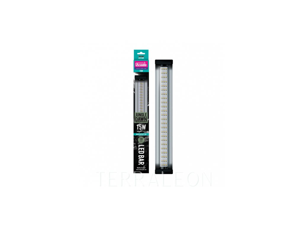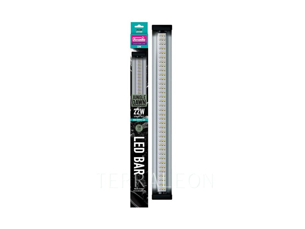Arcadia JungleDawn-LED Bar je elegantní a výkonné osvětlovací těleso, které využívá technologie LED, aby poskytoval spoustu energie živým rostlinám v teráriích a vytvářel velmi světlá místa, nutná zvláště pro druhy z pouštních oblastí nebo také chameleony. Tento systém využívá nejnovější technologie „Full Spectrum High Output“, díky kterému diody vyzařují úctyhodných 141 lumenů/1 watt. Díky elegantnímu reflektoru je světlo rozprostřeno do úhlu 120°. Těleso je určeno k umístění na drátěný kryt terária, nebo k uchycení uvnitř terárií a vivárií.