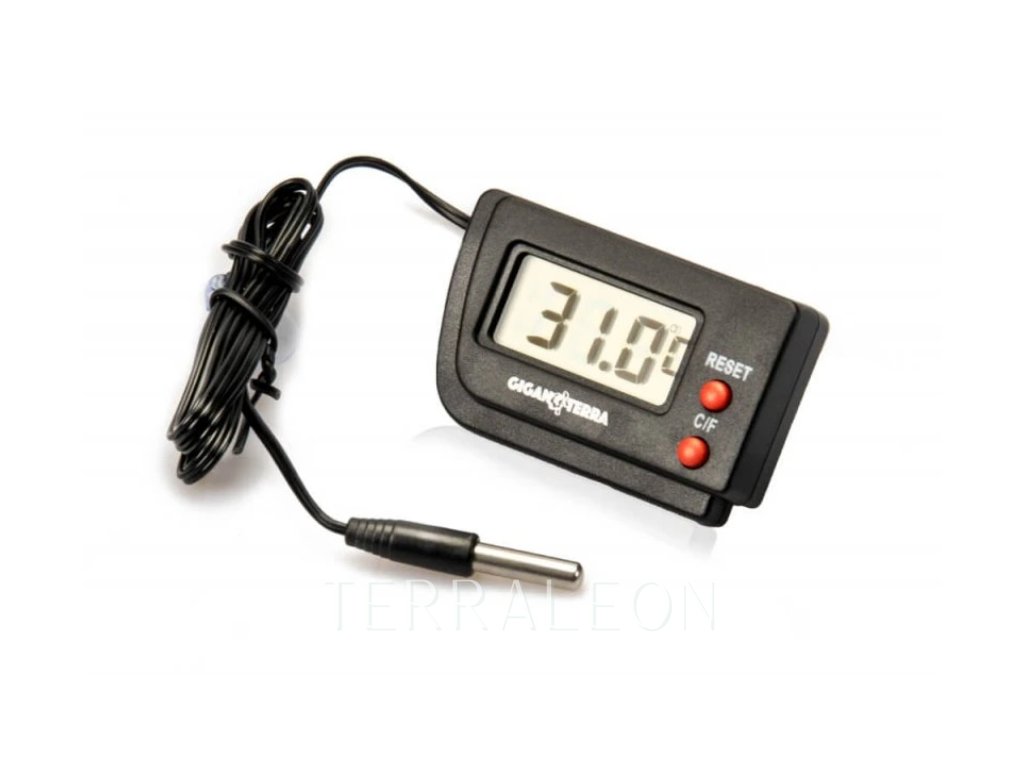 Digitální teploměr do terária s externím čidlem o délce 90 cm. Teplotní rozsah čidla je od -9 do +110°C. Samotný teploměr chraňte před teplotou vyšší než 50°C a vlhkostí přes 85 %. Externí čidlo s vysokou vlhkostí nemá problém, takže ho lze zavést i do inkubátoru. Na zadní straně teploměru je praktická opěrka umožňující postavení na viditelném místě.