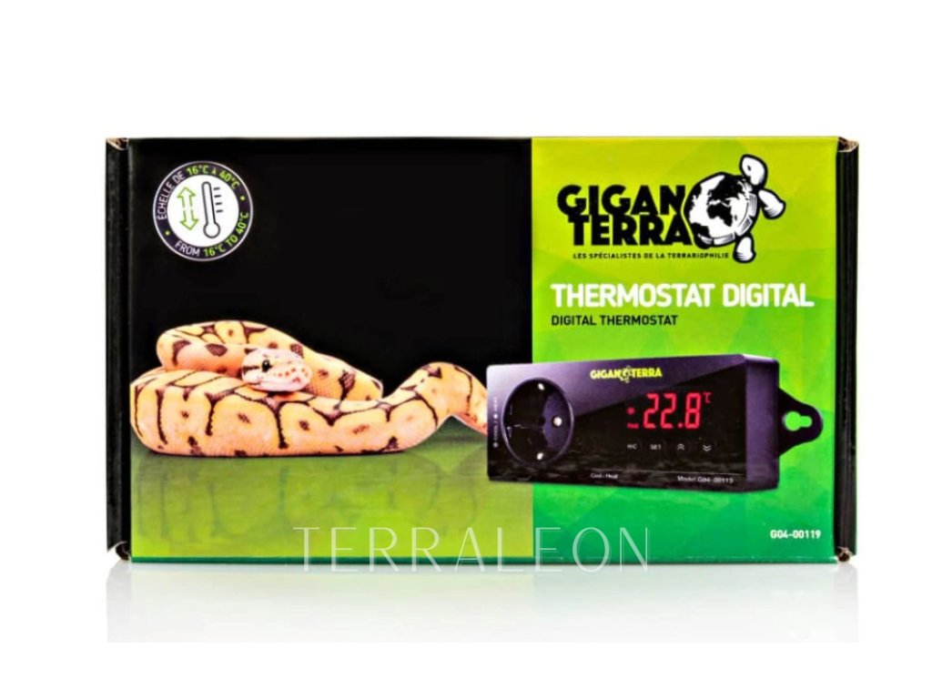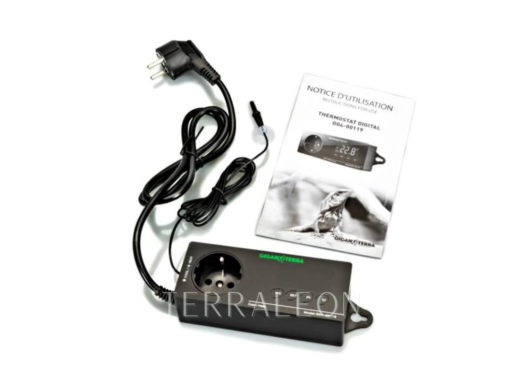 GiganTerra Digitální termostat Basic s vodotěsným čidlem o délce 1,8 m. Díky zásuvce se na něho snadno připojí tepelný zdroj (topný kabel, topné fólie, tepelný zářič) nebo chlazení (ventilátor), pomocí kterého koriguje případné změny teploty.