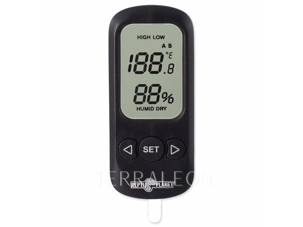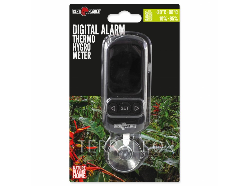 Teploměr a vlhkoměr v jednom pro sledování teploty a vlhkosti v teráriu. V případě dosažení extrémně nízkých či vysokých teplot vydá přístroj světelný signál. Vhodný k měření na jednom stálém místě. Určen k instalaci dovnitř terária – připevňuje se na sklo pomocí přísavky.