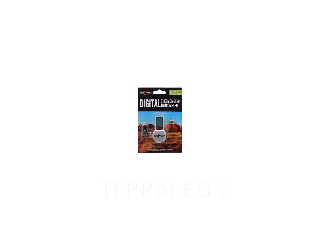 Digitální teploměr/vlhkoměr do terária s teplotním rozsahem od 10°C do 50°C. Rozsah měření vlhkosti je 20% až 90%.