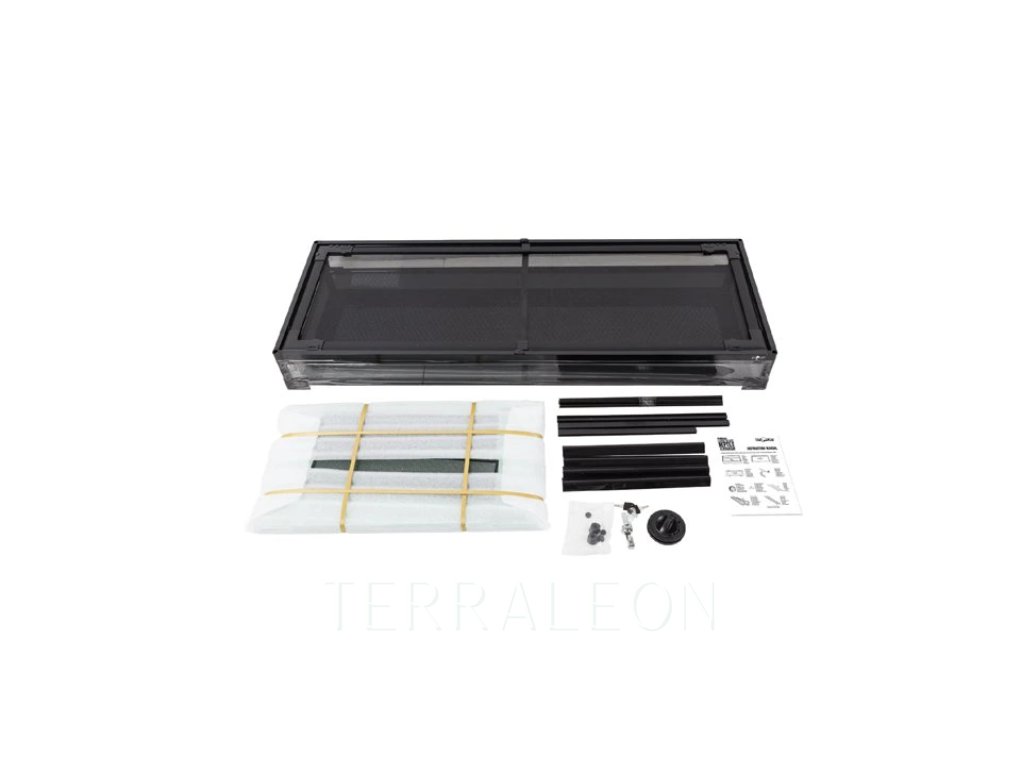 Díky nožkám vzniká pod teráriem mezera, kterou lze využít na umístění topné fólie nebo kabelu. Součástí balení je navíc terarijní zámek na posuvná skla.